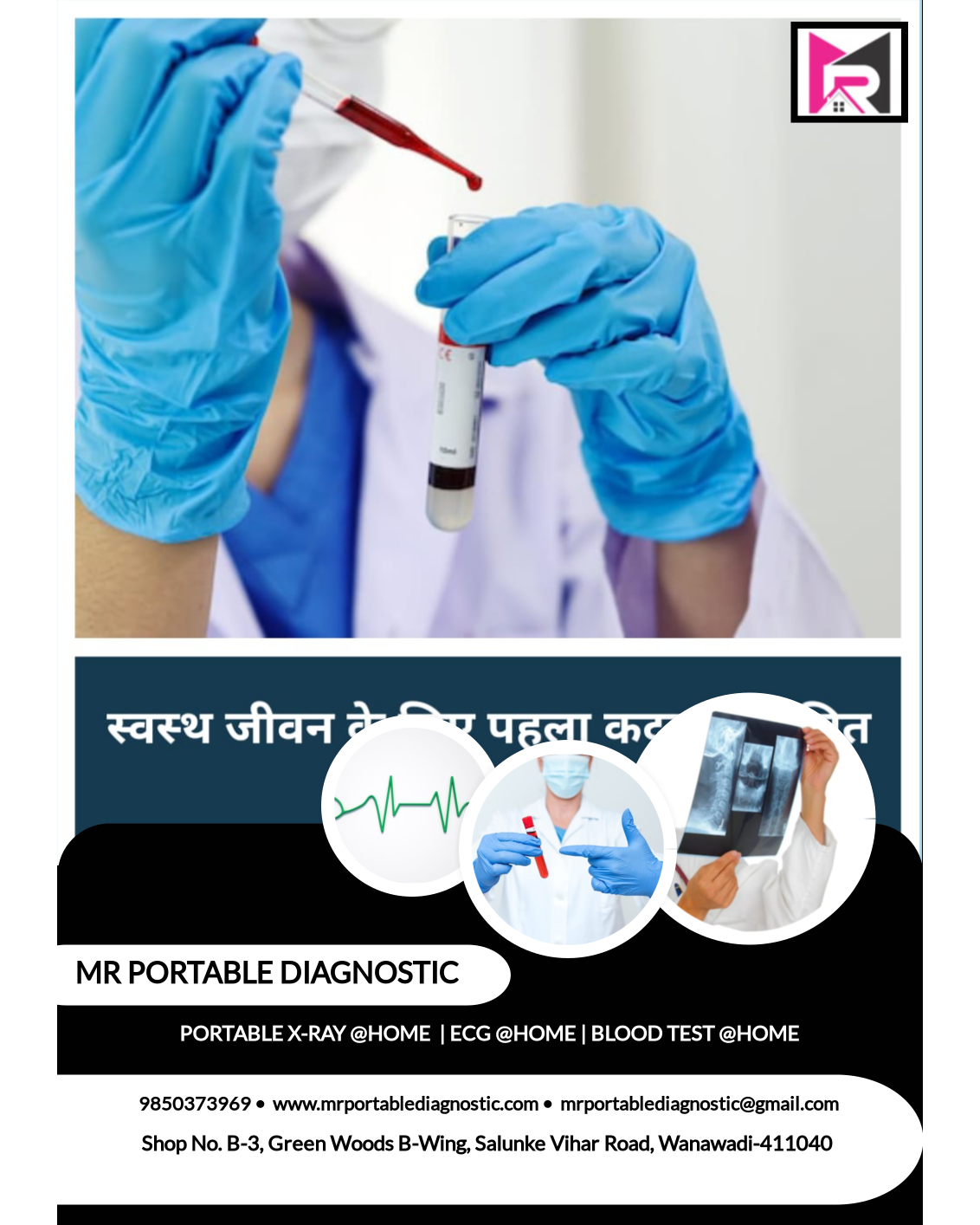MR Portable Diagnostic Centre– Healthcare That Comes to You. Experience high-quality, personalized medical care from the comfort of your home. At MR Portable Diagnostic Centre , we bring comprehensive healthcare solutions right to you—eliminating the need to travel to clinics or hospitals. Our services include, Digital X-rays, ECGs, Blood sample collection, Urine tests And more diagnostic services. “Book your at-home appointment today and experience quality care at a time that works best for you.”