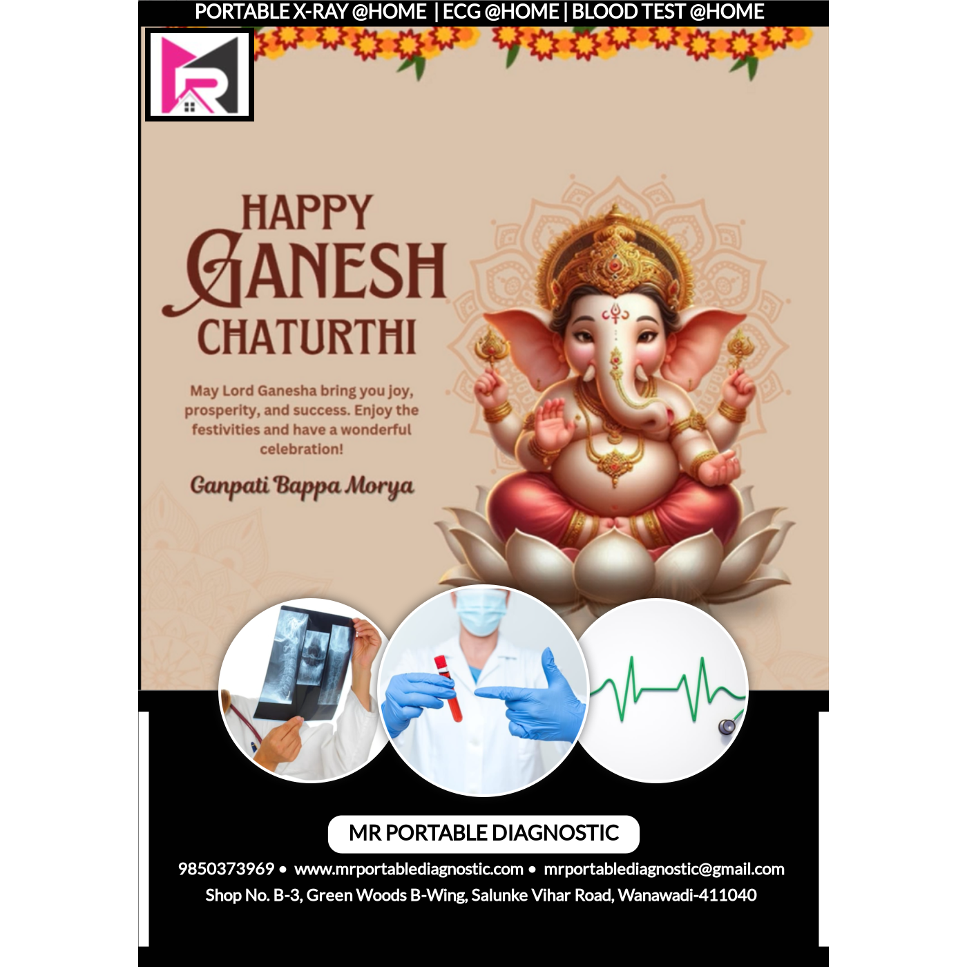 Wishing you a very Happy Ganesh Chaturthi from MR Portable Diagnostic Centre and our family. May Lord Ganesha bless you with good health, a disease-free and prosperous life, and take away all your problems, tensions, and worries. Ganpati Bappa Morya!'